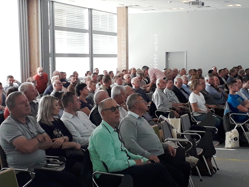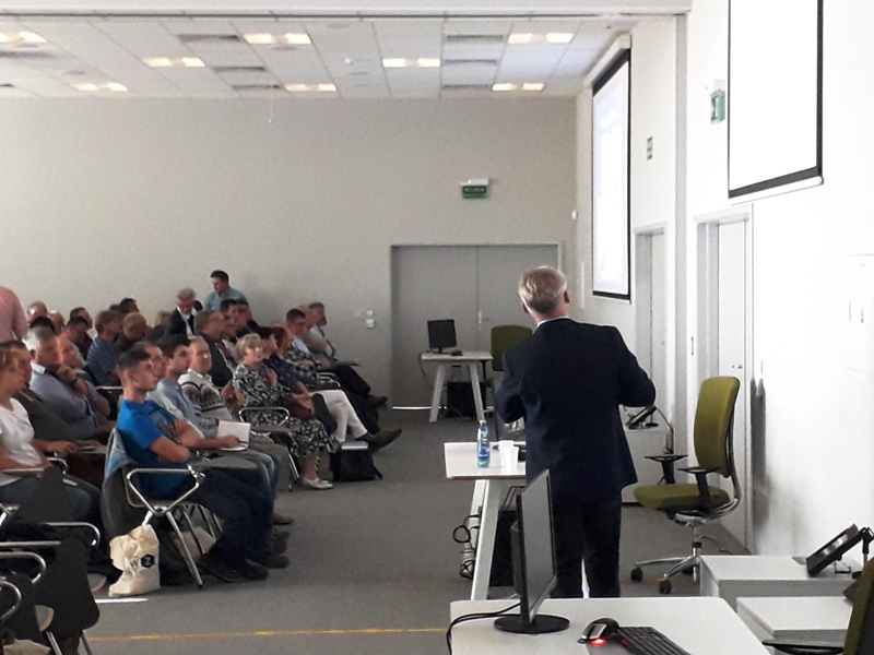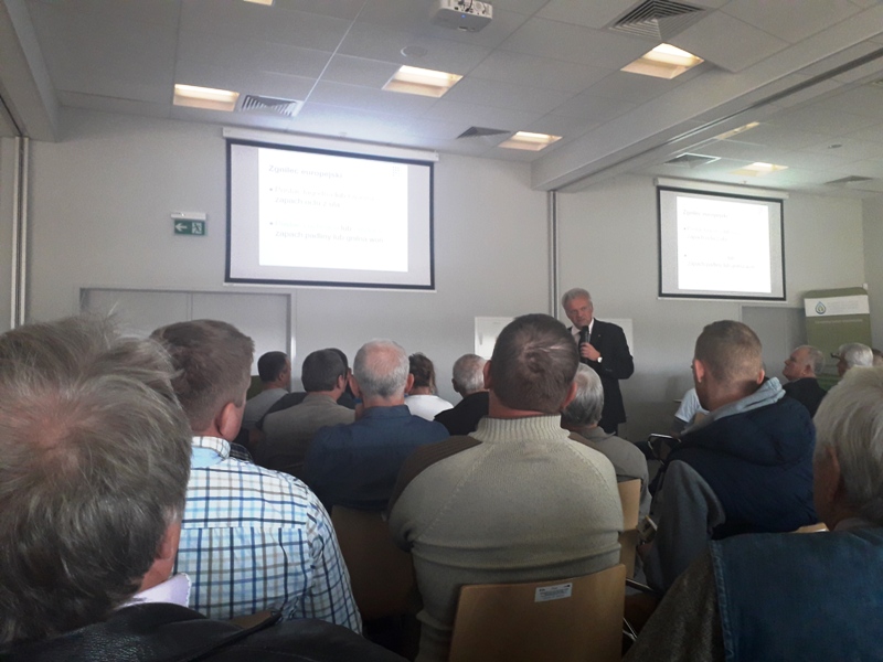 Następnie rozpoczęła się część konferencyjna. Pierwszy prelegent prof. Paweł Chorbiński bardzo ciekawie mówił na temat zgnilca oraz innych chorób pszczół, następnie prof. Zbigniew Kotłowski przedstawił wykład na temat pożytków pszczelich a na końcu dr Jerzy Samborski powiedział o gospodarce pasiecznej. W trakcie szkolenia czekał na nas pyszny obiad oraz wiadro z paszą dla pszczół firmy Kellmann.