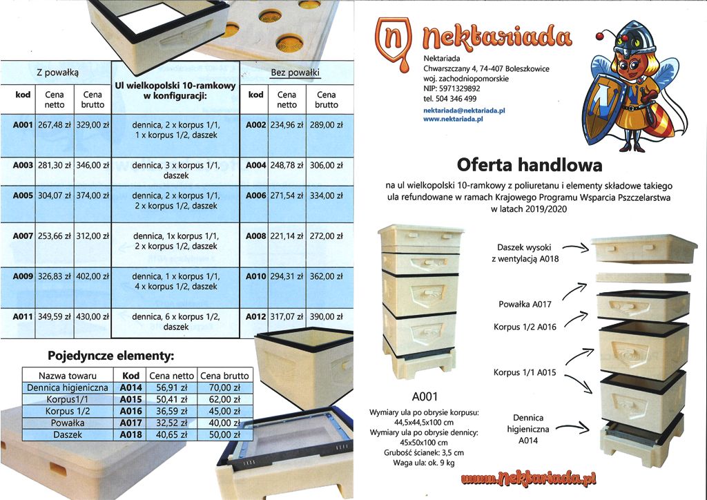 Otrzymaliśmy listownie ofertę, producenta uli poliuretanowych, firmy Nektariada przygotowaną specjalnie dla naszego koła. Poniżej załączam skany wraz z kuponem rabatowym. Ule te można zamawiać w ramach refundacji Krajowego Programu Wsparcia Pszczelarstwa bądź poza refundacją.