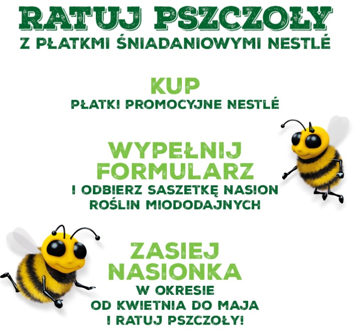 „Odbierz nasiona i ratuj pszczoły!” pod takim hasłem zorganizowała akcję firma Nestle. Wystarczy kupić paczkę płatków i wypełnić formularz na stronie aby otrzymać paczkę nasion roślin miododajnych. Szczegóły na stronie: https://www.nestle-cereals.com/pl/pl/ratujpszczoly