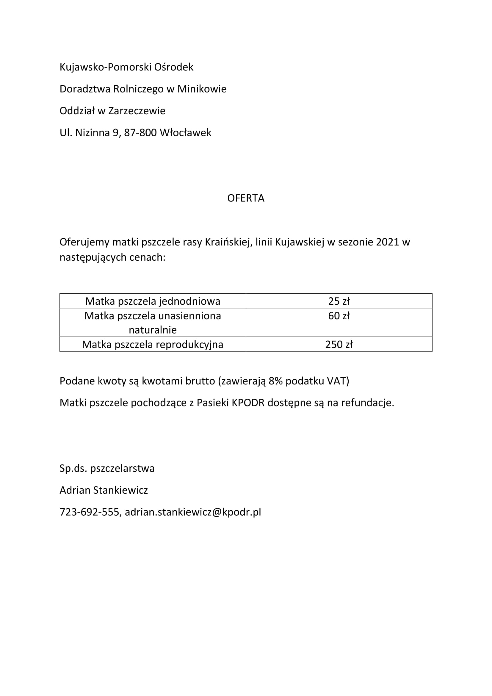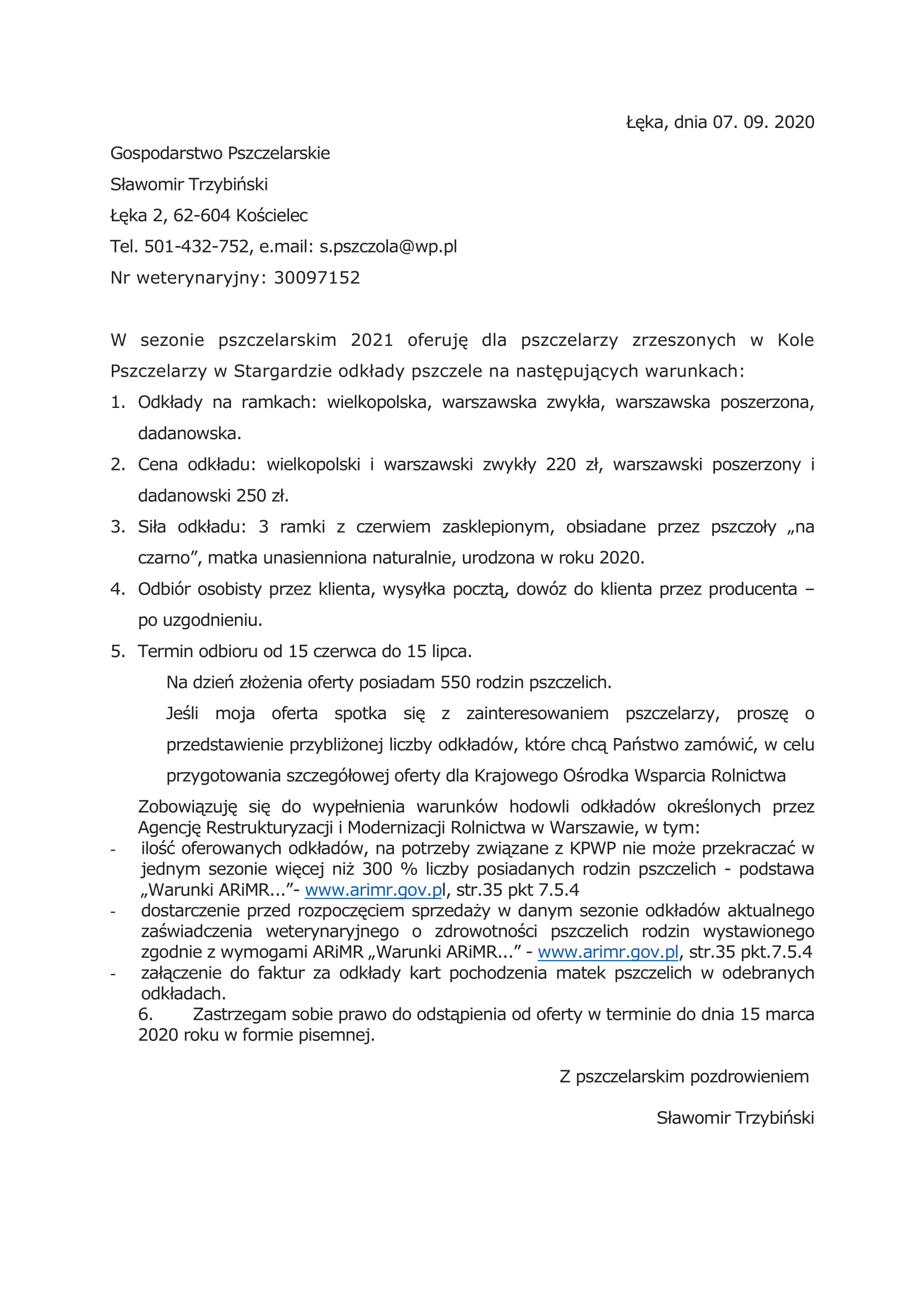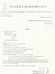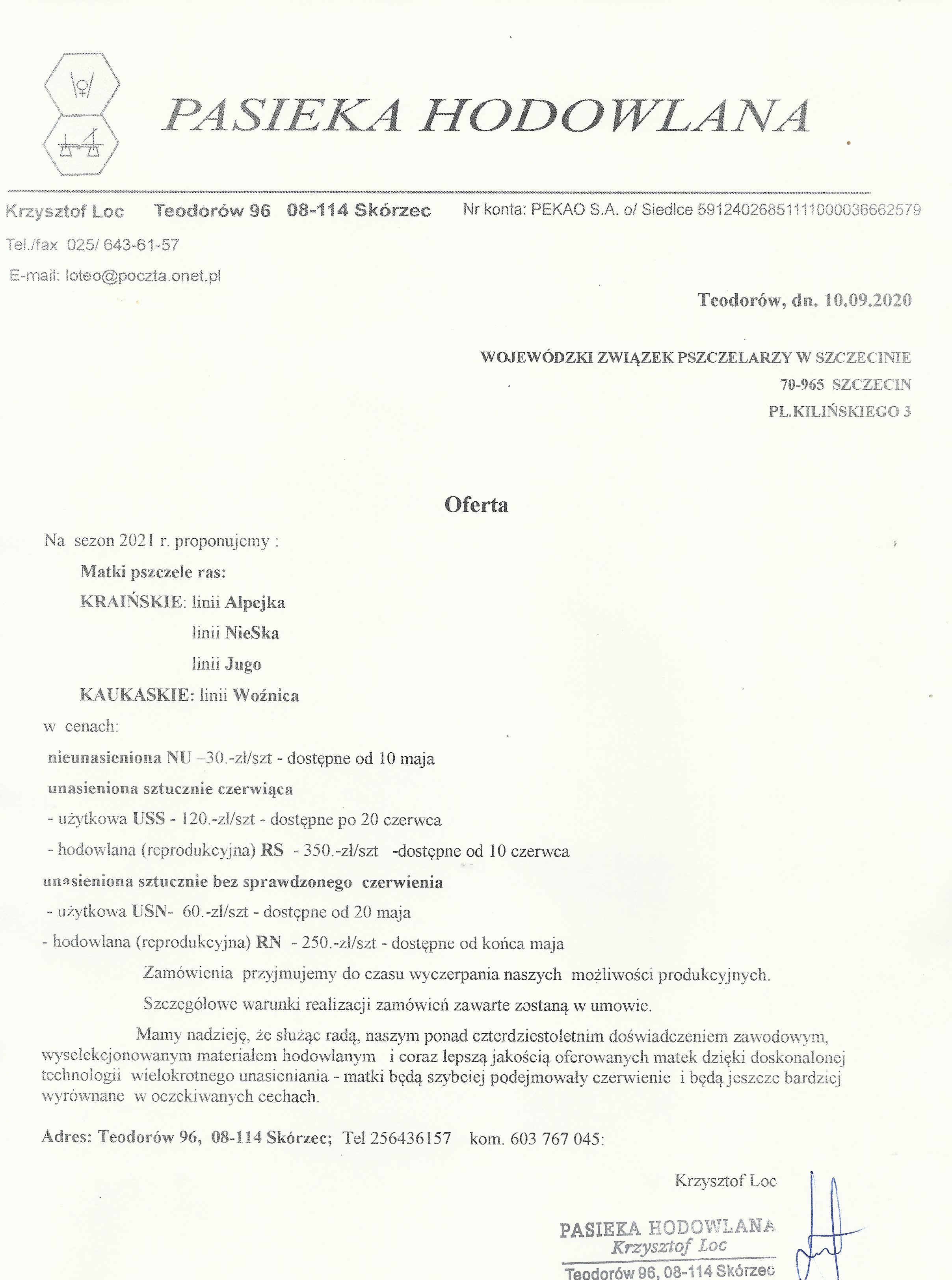 Uprzejmie proszę o zgłaszanie chęci zakupy matek i odkładów pszczelich na 2021 rok. Zgłoszenia wysyłamy na maila koła lub telefonicznie do prezesa. Przypominam, że limit zakupów to 50% posiadanej liczby rodzin jeśli chodzi o matki a 20% odkłady. Poniżej znajdują się oferty przesłane do Koła Pszczelarzy w Stargardzie na królowe pszczele oraz rodziny pszczele od polskich hodowców.