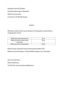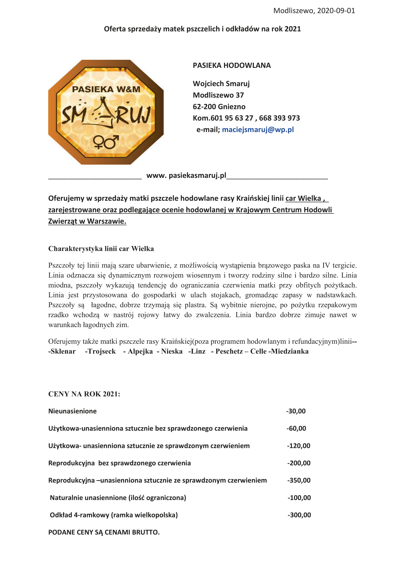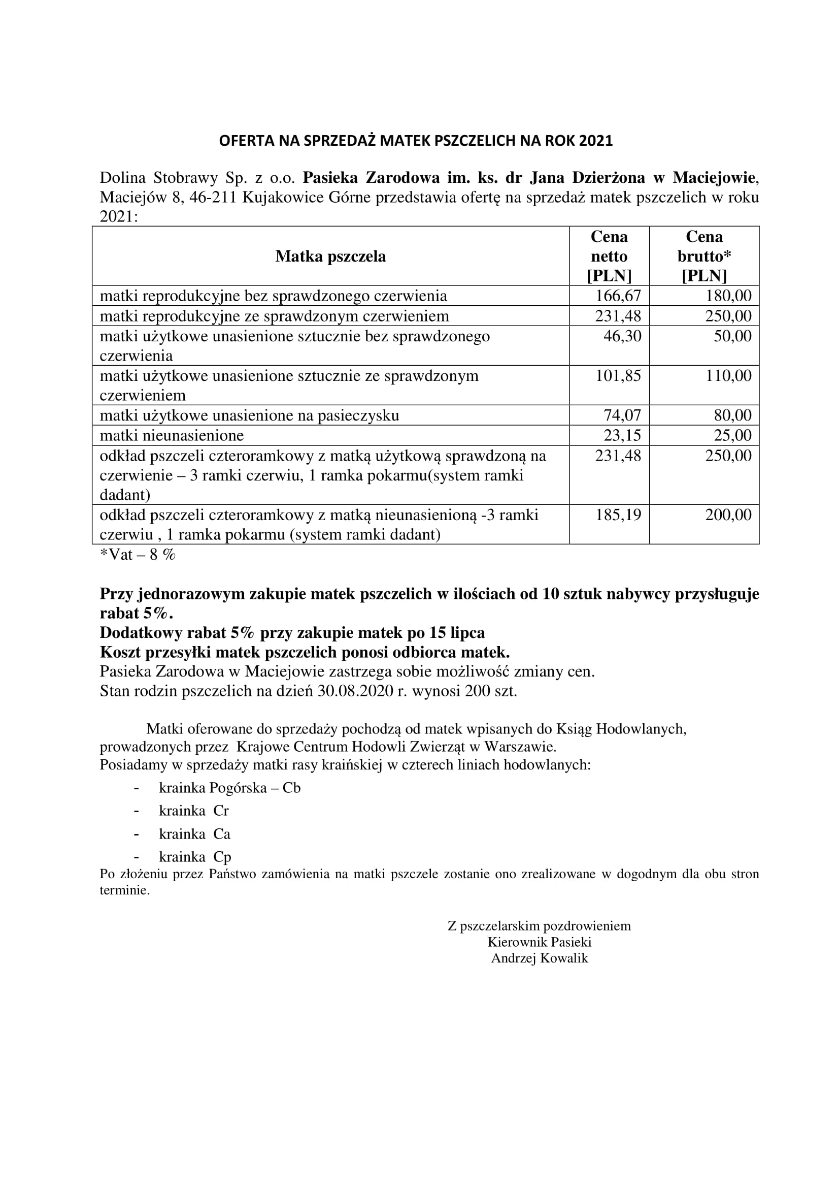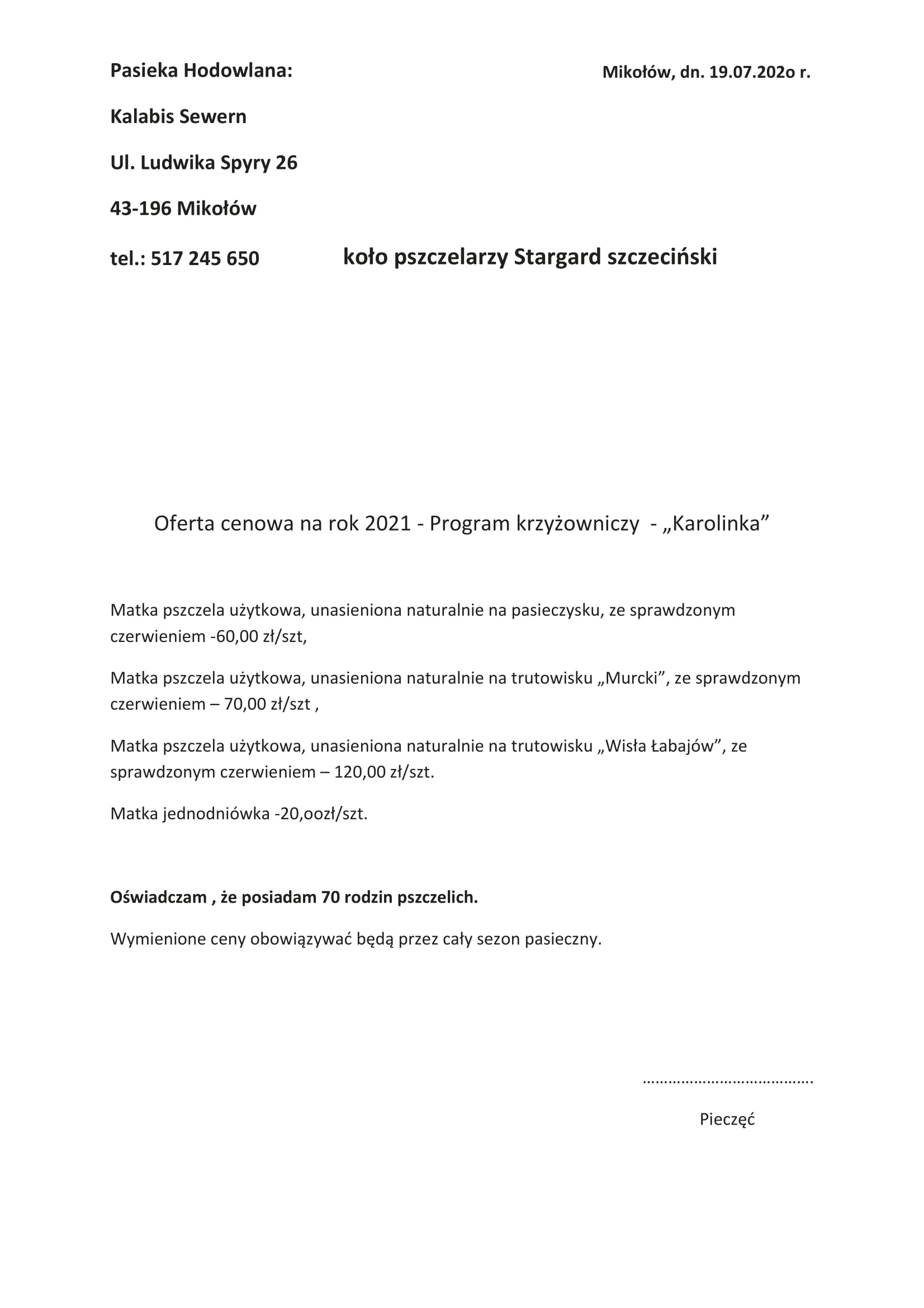 Uprzejmie proszę o zgłaszanie chęci zakupy matek i odkładów pszczelich na 2021 rok. Zgłoszenia wysyłamy na maila koła lub telefonicznie do prezesa. Przypominam, że limit zakupów to 50% posiadanej liczby rodzin jeśli chodzi o matki a 20% odkłady. Poniżej znajdują się oferty przesłane do Koła Pszczelarzy w Stargardzie na królowe pszczele oraz rodziny pszczele od polskich hodowców.